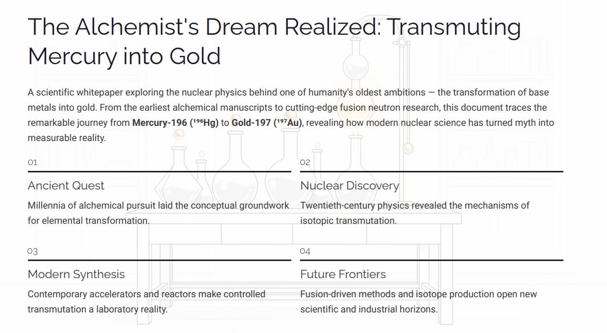 A scientific whitepaper exploring the nuclear physics behind one of humanity’s oldest ambitions — the transformation of base metals into gold.