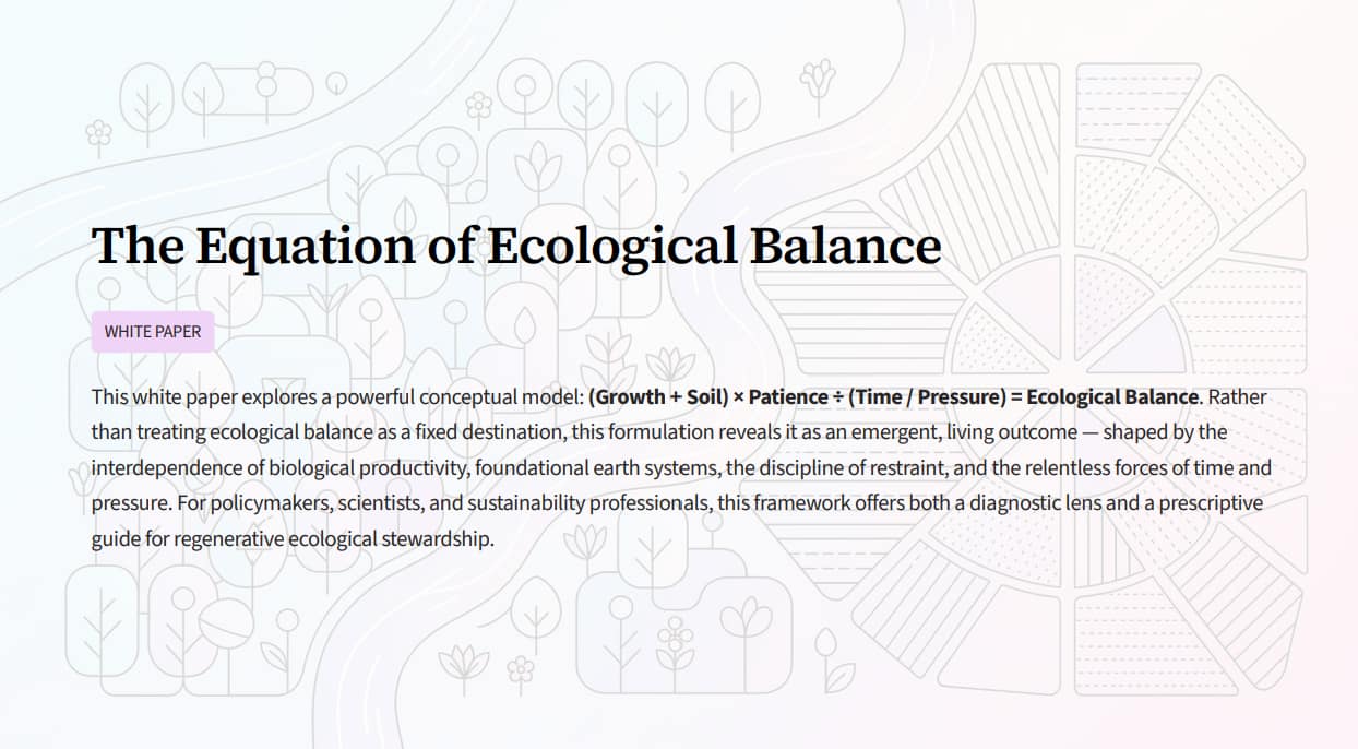 This white paper explores a powerful conceptual model: (Growth + Soil) × Patience ÷ (Time / Pressure) = Ecological Balance. Rather than treating ecological balance as a fixed destination, this formulation reveals it as an emergent, living outcome 4 shaped by the interdependence of biological productivity, foundational earth systems, the discipline of restraint, and the relentless forces of time and pressure.